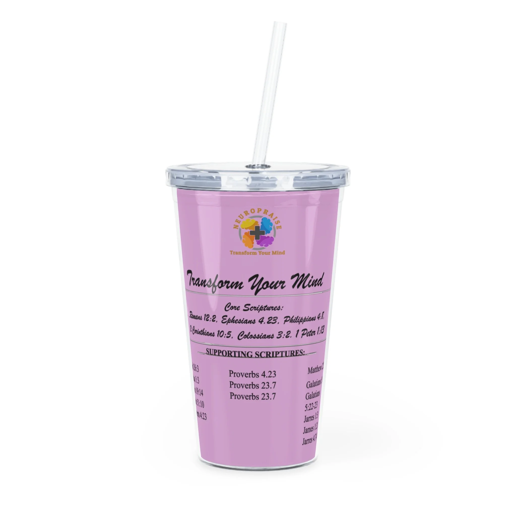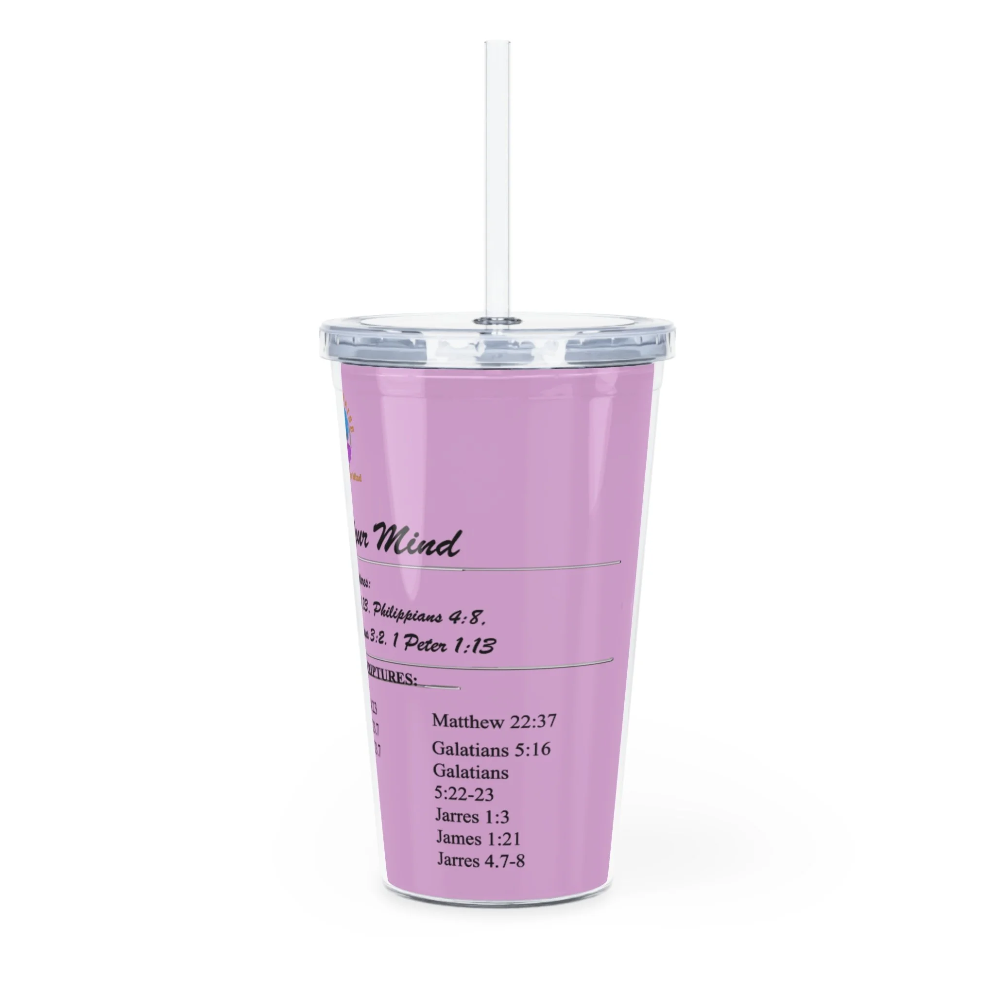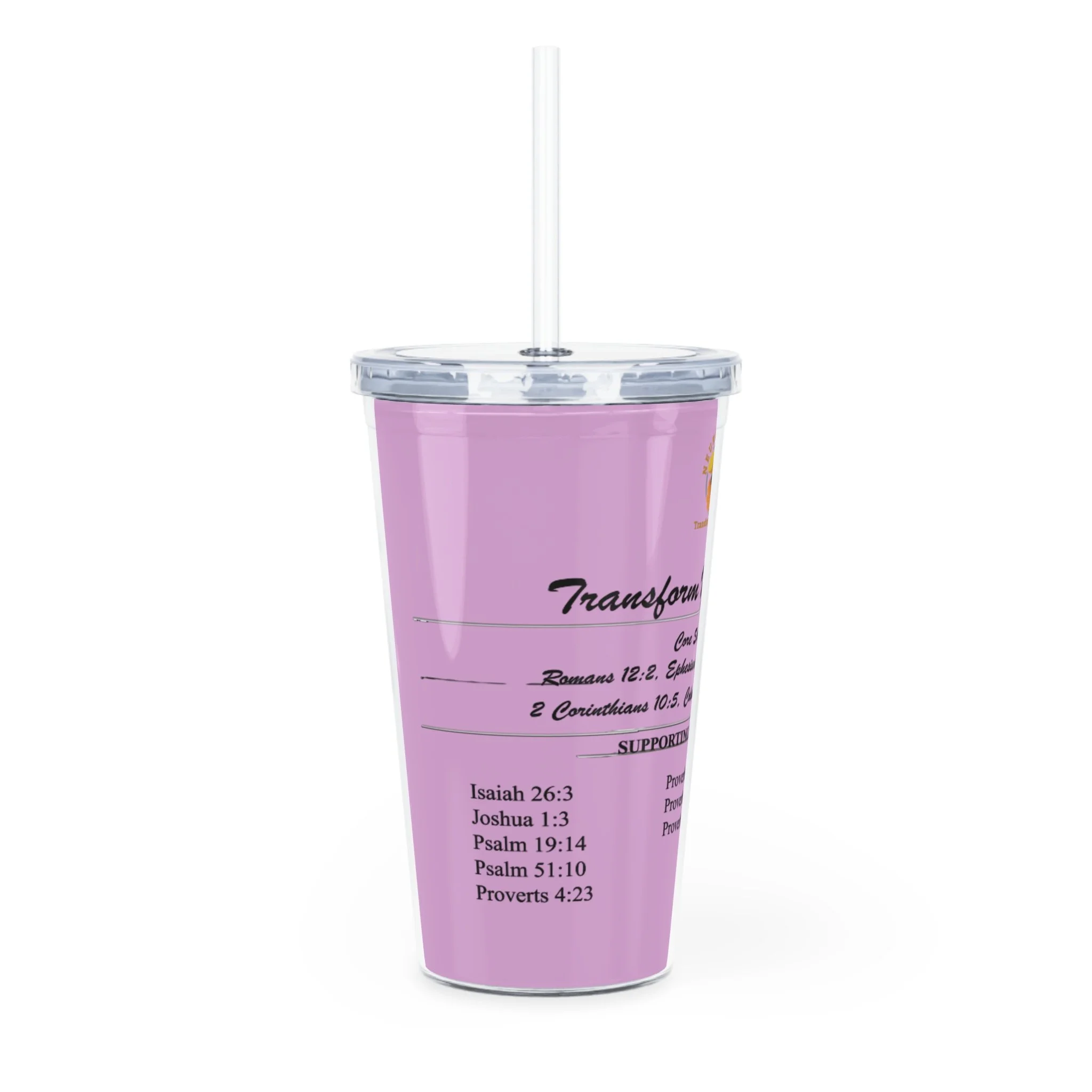 A bright, travel-ready tumbler designed to keep a little daily encouragement close at hand. The double-wall plastic cup holds 20oz and snaps closed with a clear lid and reusable straw, while the removable insert lets a custom design — scripture lines and uplifting headings in crisp, vibrant print — sit between the walls for safe, splash-proof display. It sits comfortably in cup holders, resists hot liquids (do not microwave), and feels light enough to carry from the morning commute to a quiet moment at home. The cheerful, pastel background and readable type make it easy to sip and reflect between errands or during a pew-side devotional.